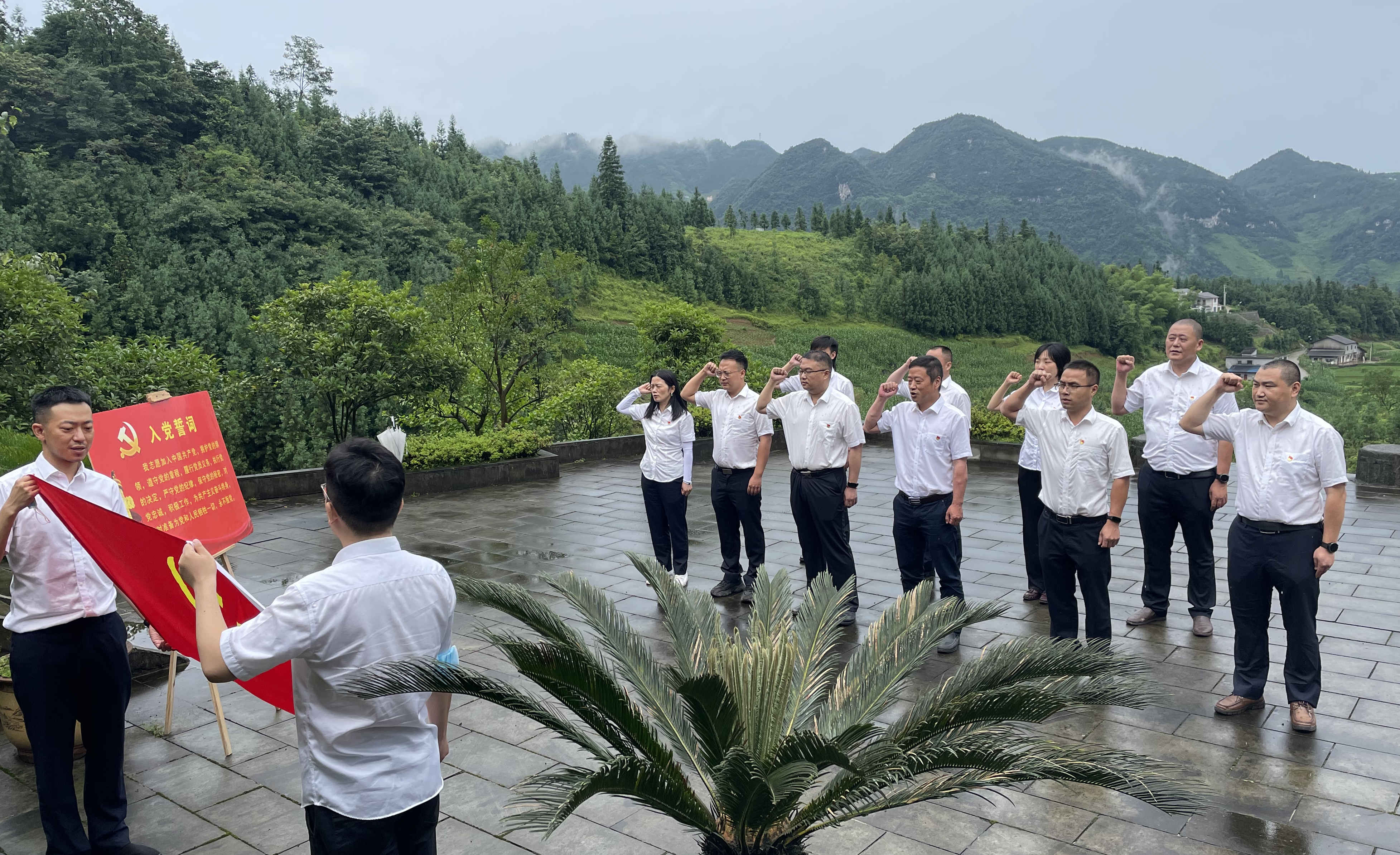 黨課最后,與會(huì)人員手持黨旗,拍攝“全家福”。
