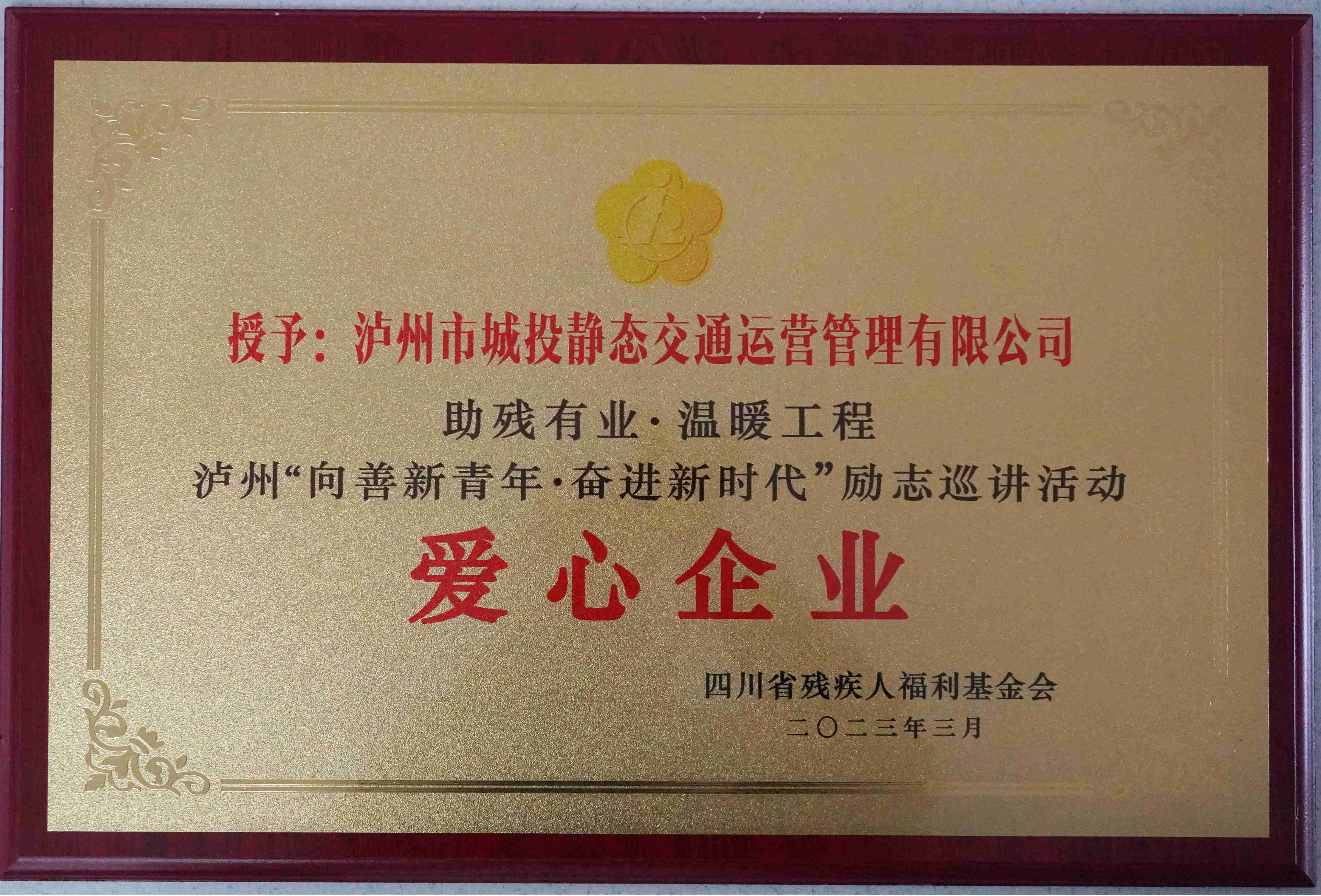 3月29日,在“助殘有業(yè)·溫暖工程”暨“酒城助殘就業(yè)創(chuàng)業(yè)公益聯(lián)盟”啟動(dòng)儀式上,瀘州城投集團(tuán)下屬靜態(tài)交通公司被授予“愛心企業(yè)”榮譽(yù)稱號(hào)。