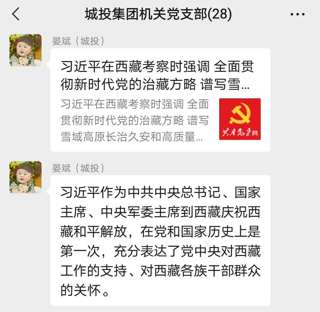 8月3日至6日,瀘州城投集團(tuán)各級(jí)黨組織通過(guò)學(xué)習(xí)強(qiáng)國(guó)、線上微信群等多方式、多渠道學(xué)習(xí)貫徹習(xí)近平總書(shū)記在西藏考察期間重要講話精神。