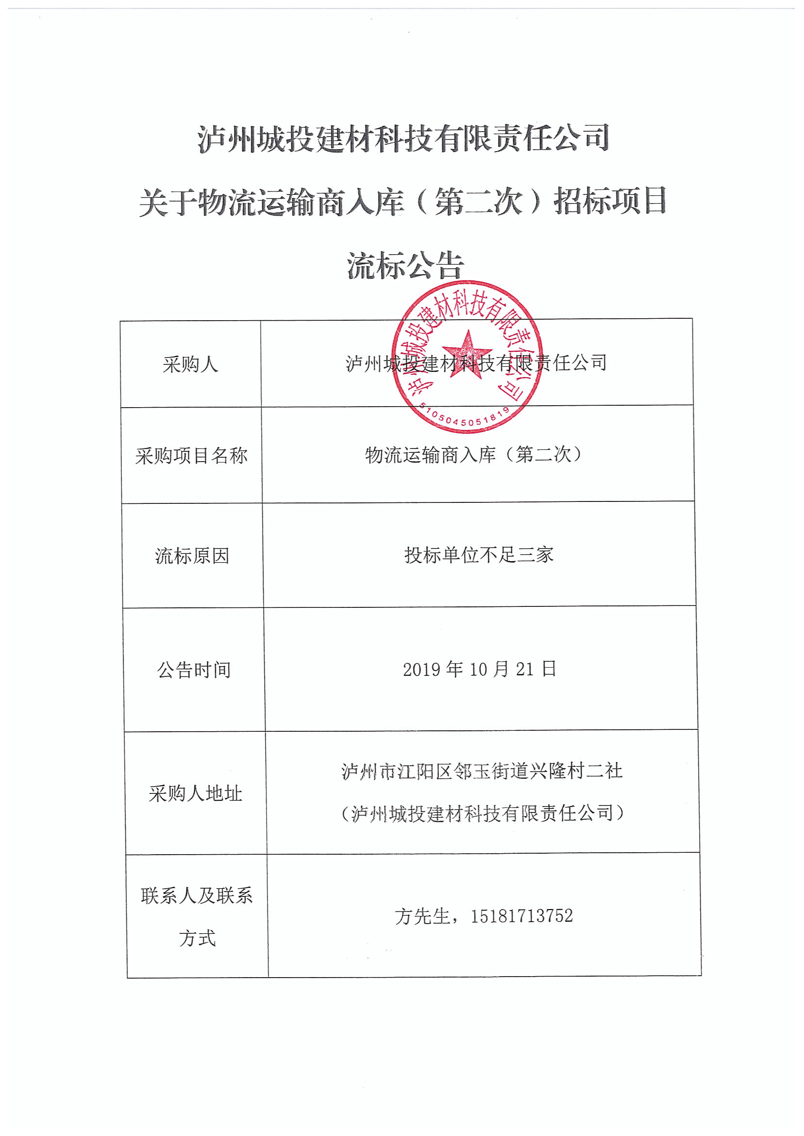關(guān)于物流運輸商入庫(第二次)招標項目流標公告