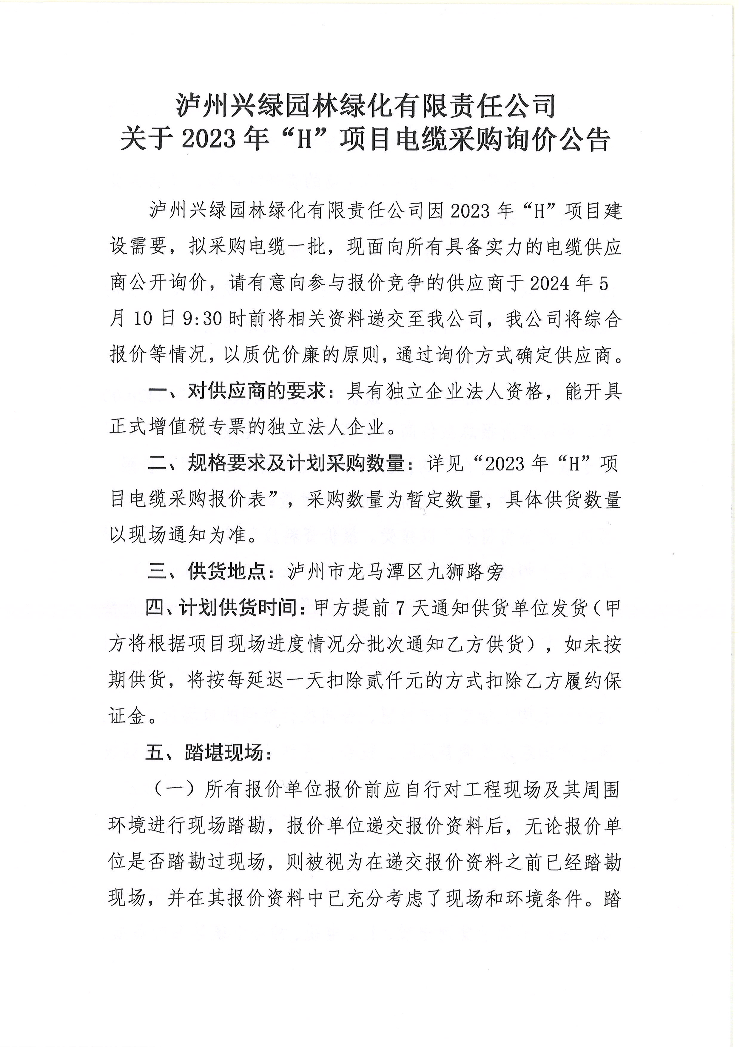 瀘州興綠園林綠化有限責(zé)任公司 關(guān)于2023年“H”項目電纜采購詢價公告