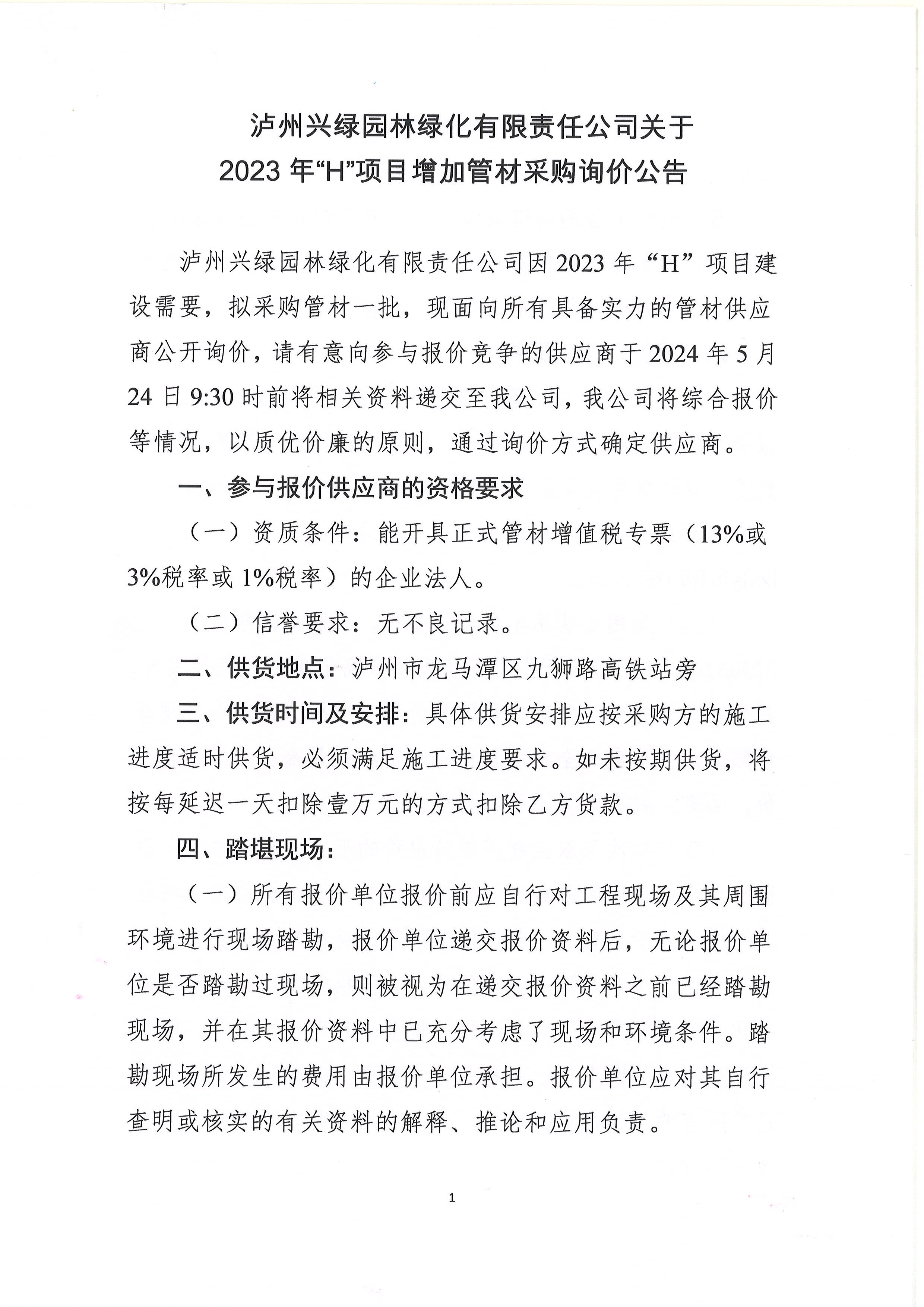 2023年“H”項目增加管材采購詢價公告