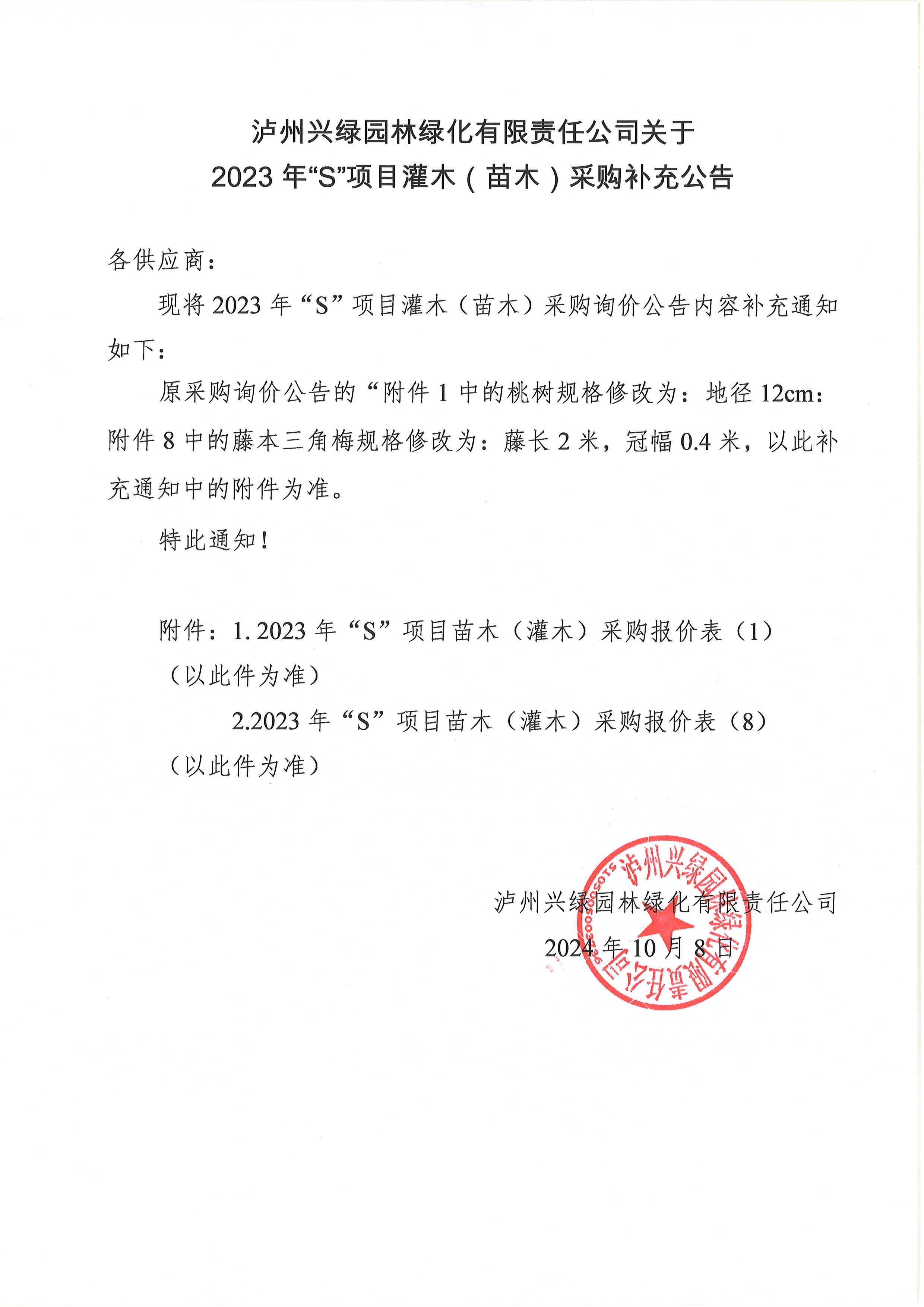瀘州興綠園林綠化有限責(zé)任公司關(guān)于2023年“S”項(xiàng)目灌木(苗木)采購(gòu)補(bǔ)充公告