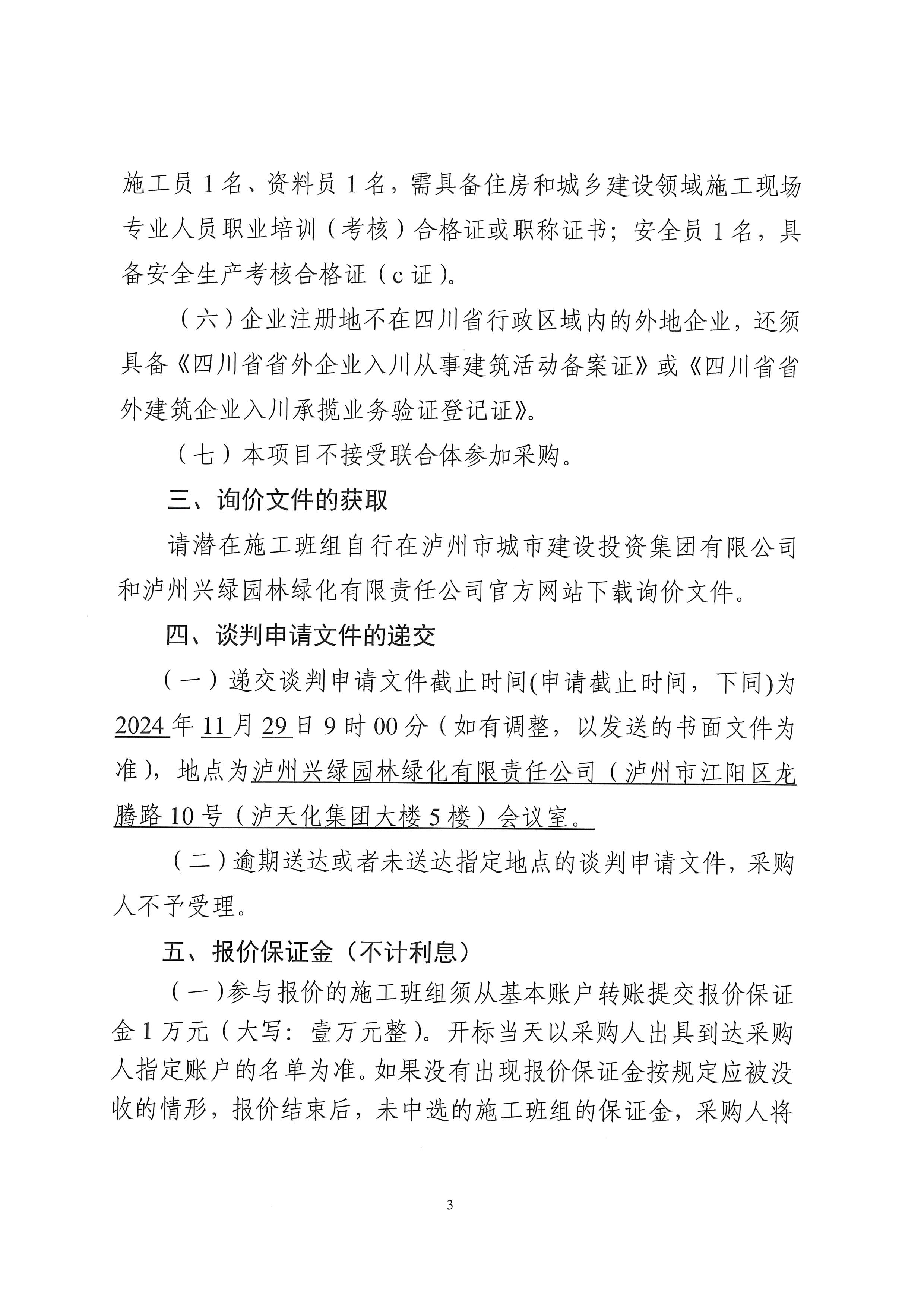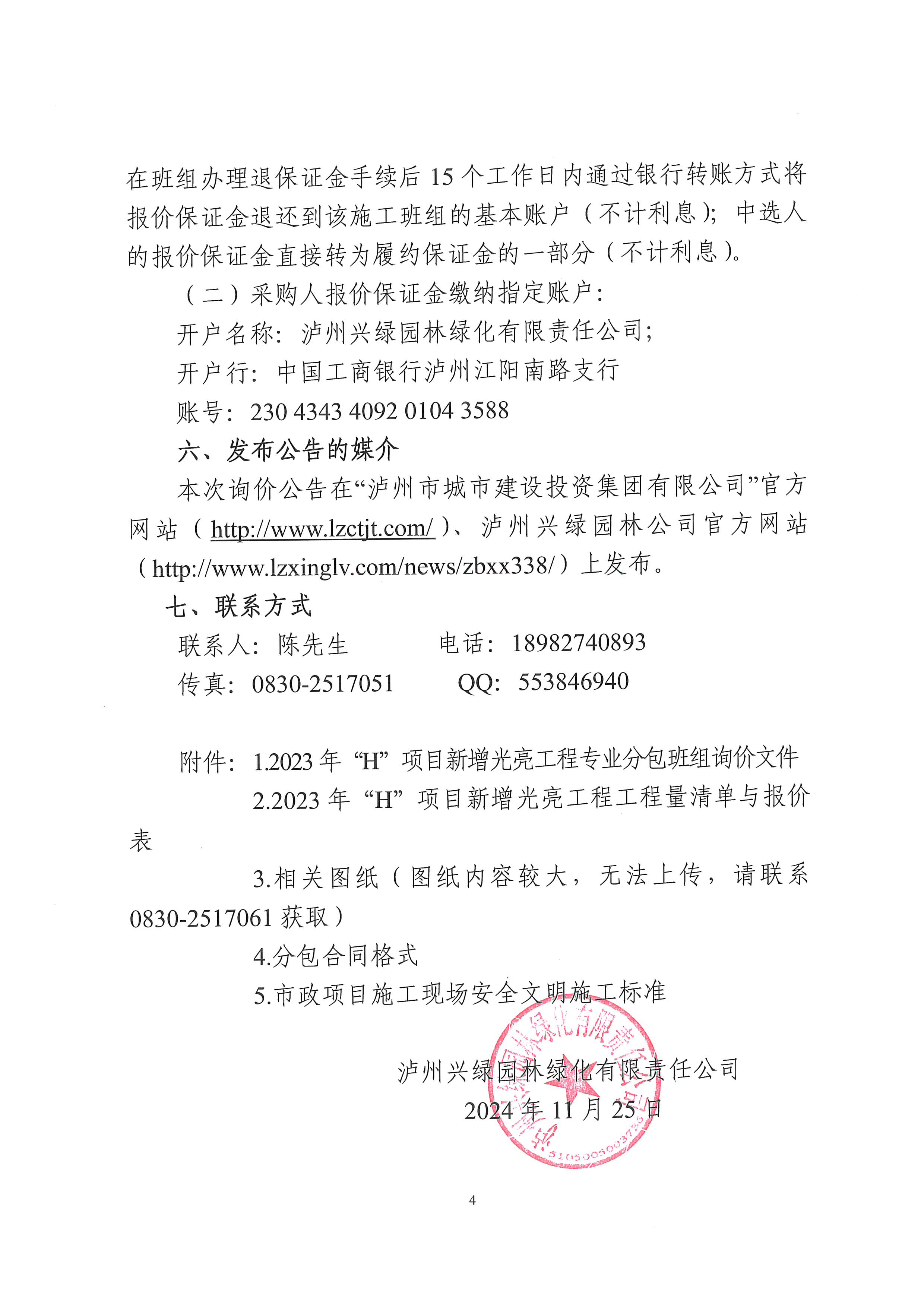 瀘州興綠園林綠化有限責(zé)任公司關(guān)于2023年“H”項(xiàng)目新增光亮工程專業(yè)分包班組詢價(jià)公告