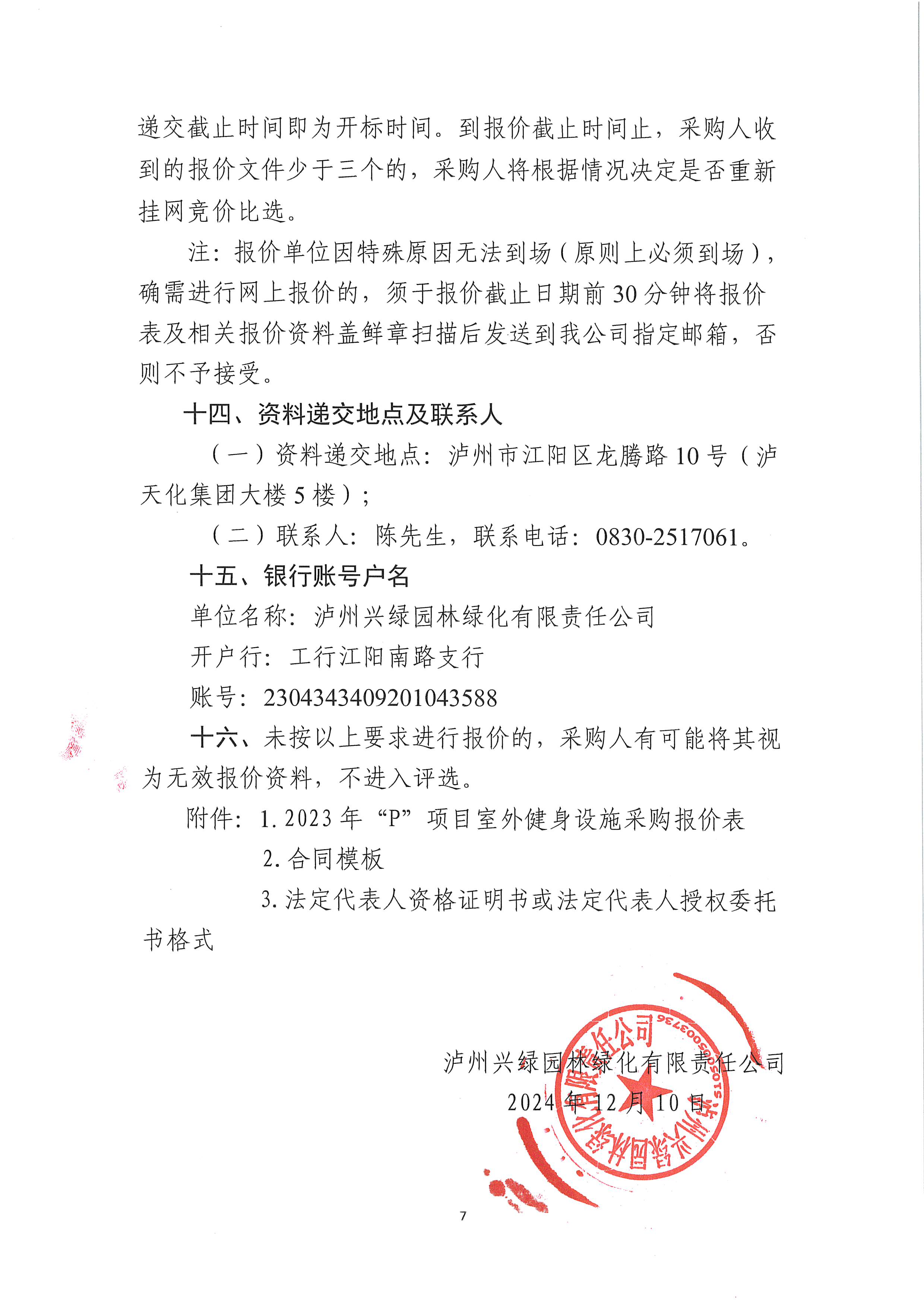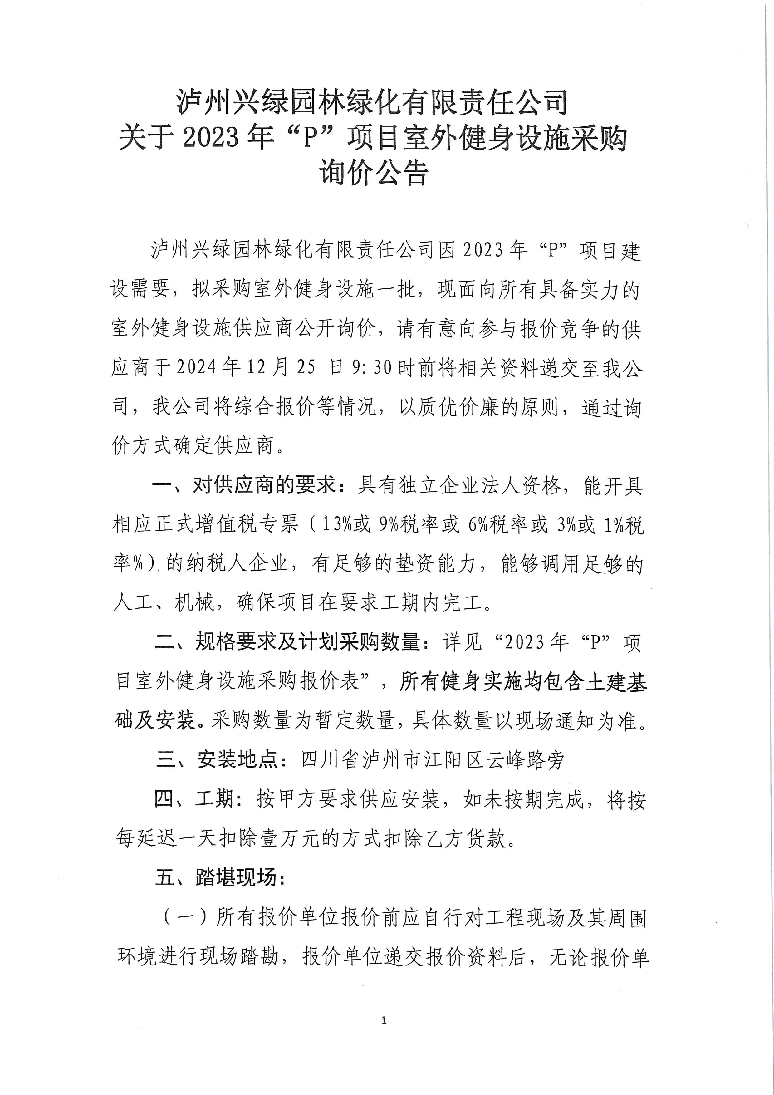 瀘州興綠園林綠化有限責任公司關于2023年“P”項目室外健身設施采購詢價公告