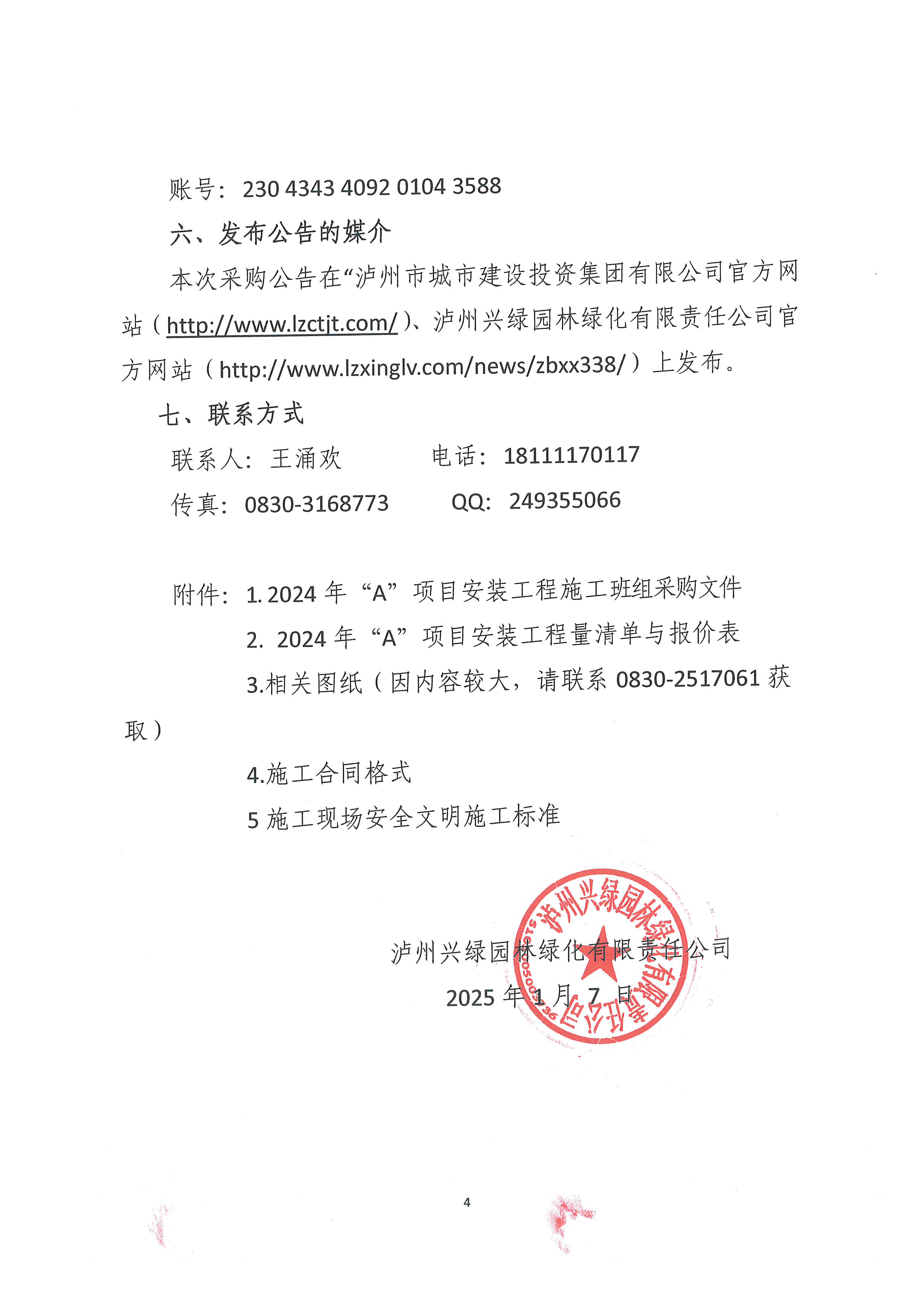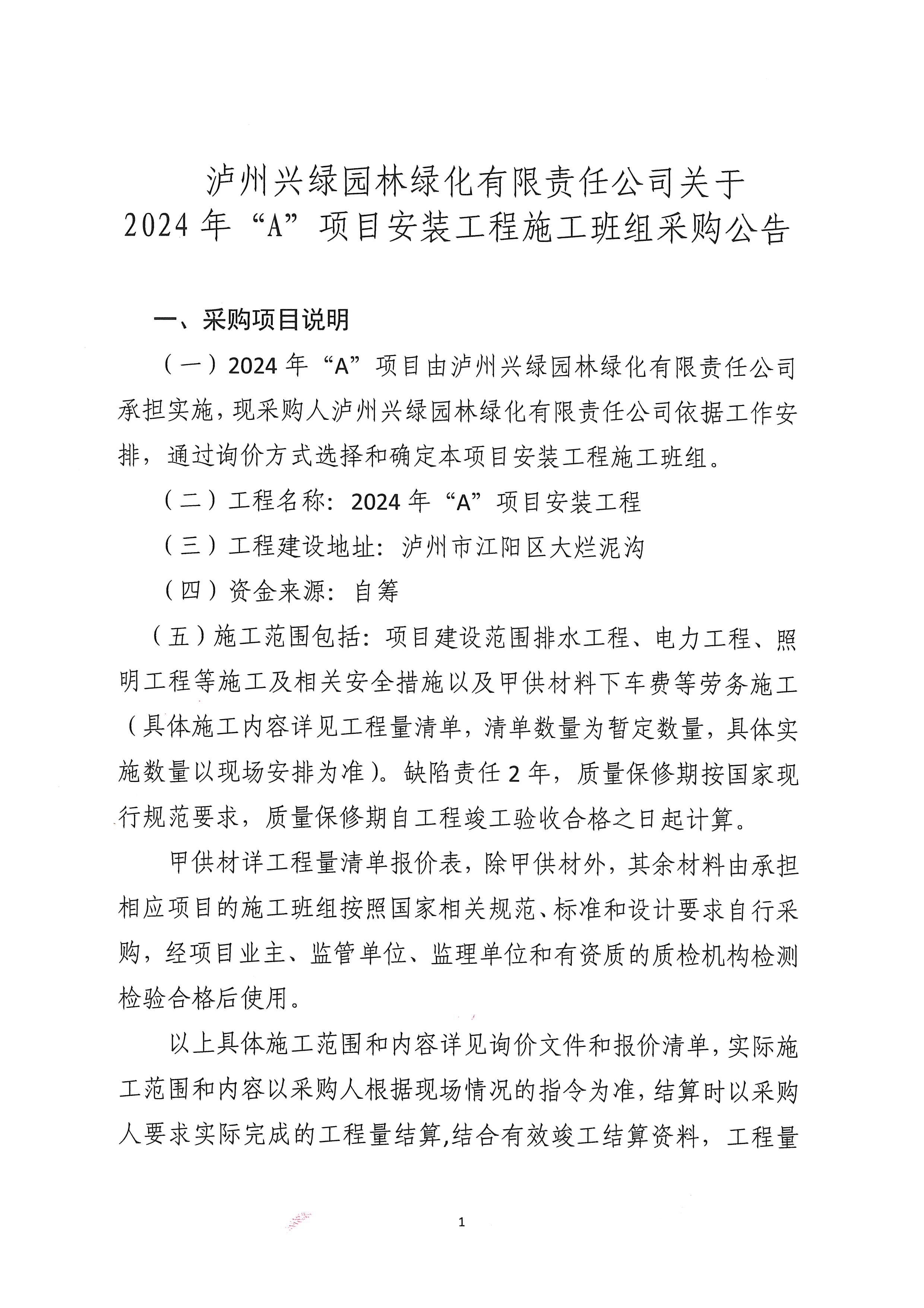 瀘州興綠園林綠化有限責任公司關(guān)于2024年“A”項目安裝工程施工班組采購公告