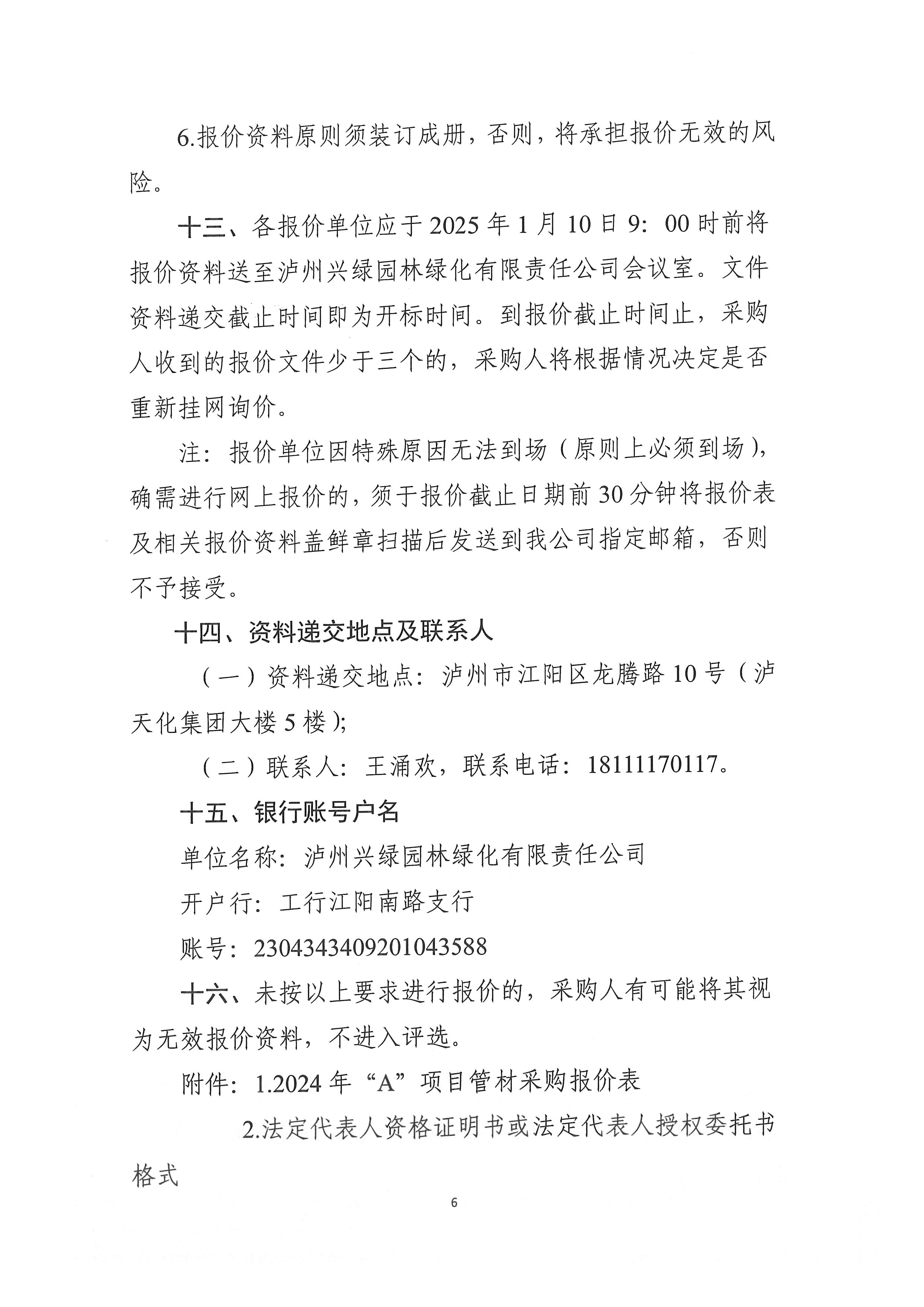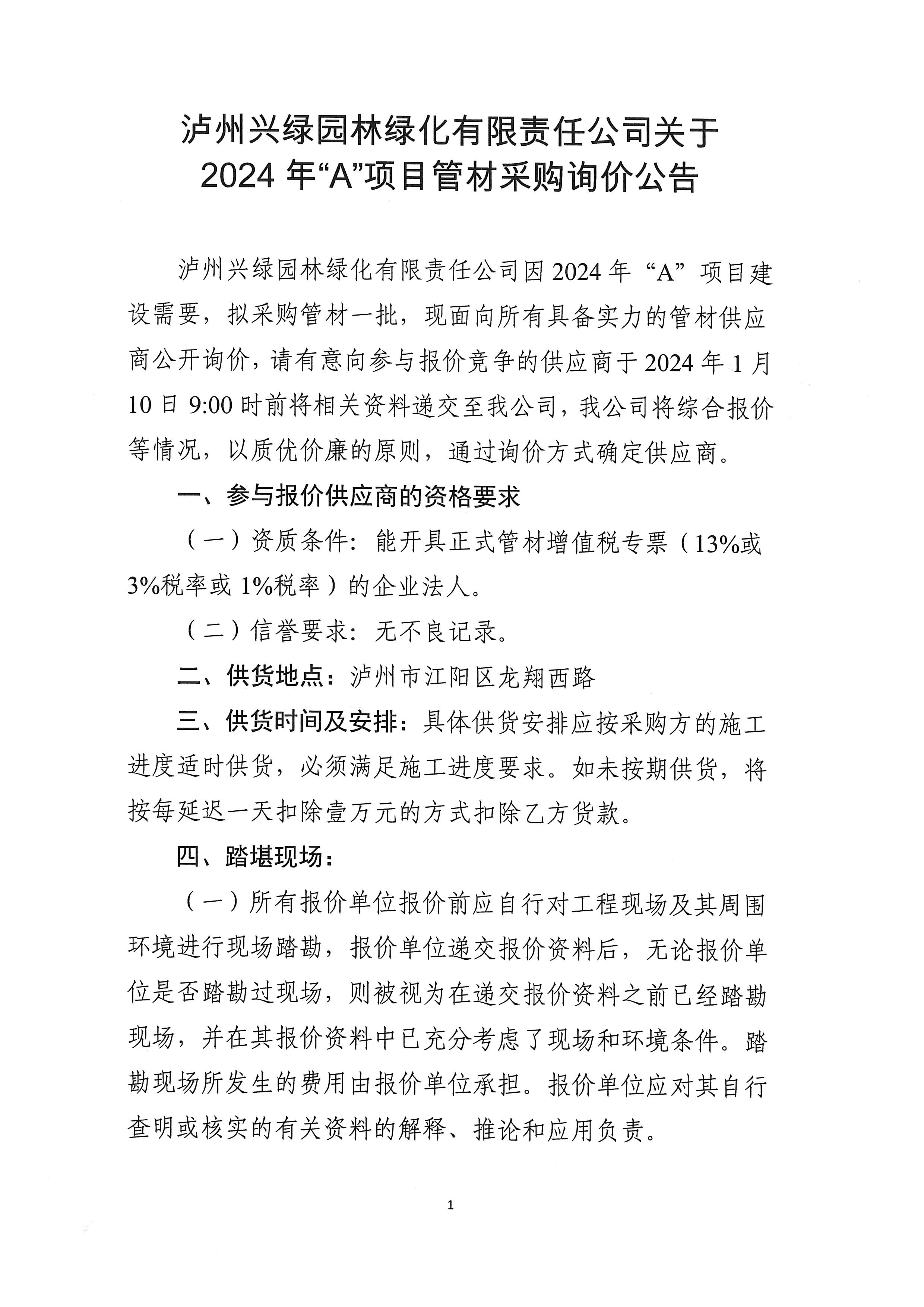 瀘州興綠園林綠化有限責(zé)任公司關(guān)于2024年“A”項目管材采購詢價公告