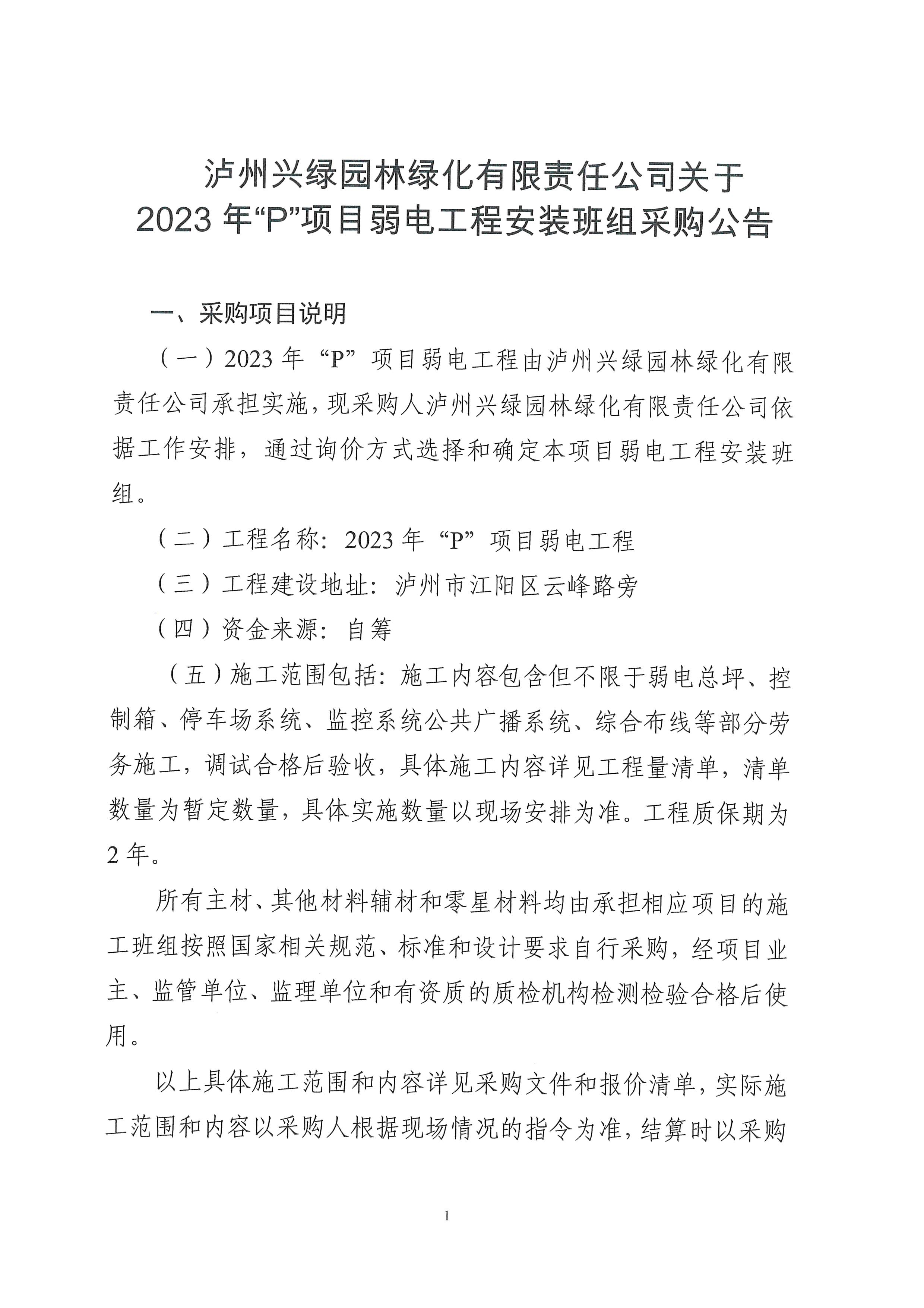 瀘州興綠園林綠化有限責(zé)任公司關(guān)于2023年“P”項(xiàng)目弱電工程安裝班組采購(gòu)公告
