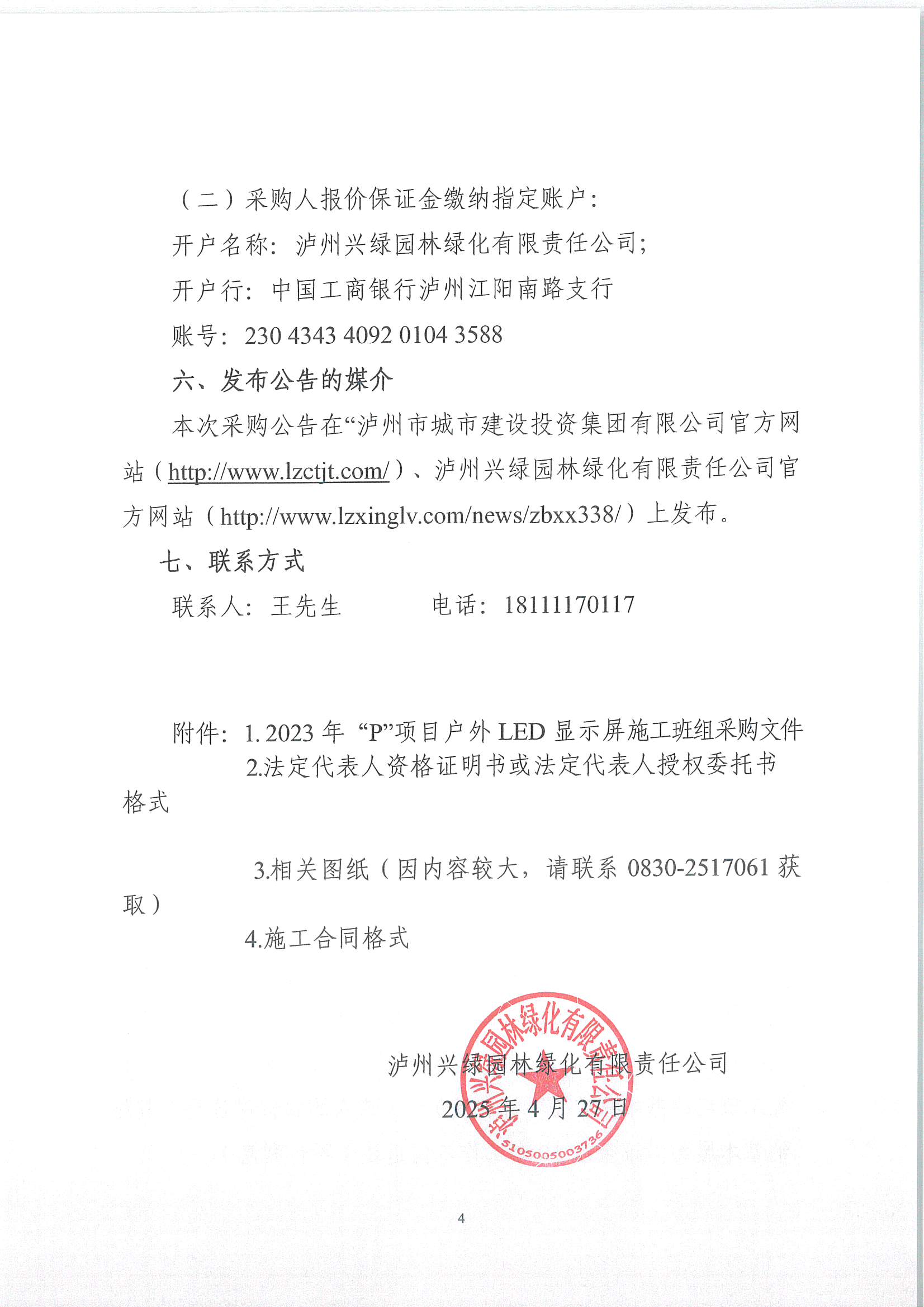 瀘州興綠園林綠化有限責(zé)任公司關(guān)于2023年“P”項(xiàng)目戶外LED顯示屏施工班組 采購(gòu)公告