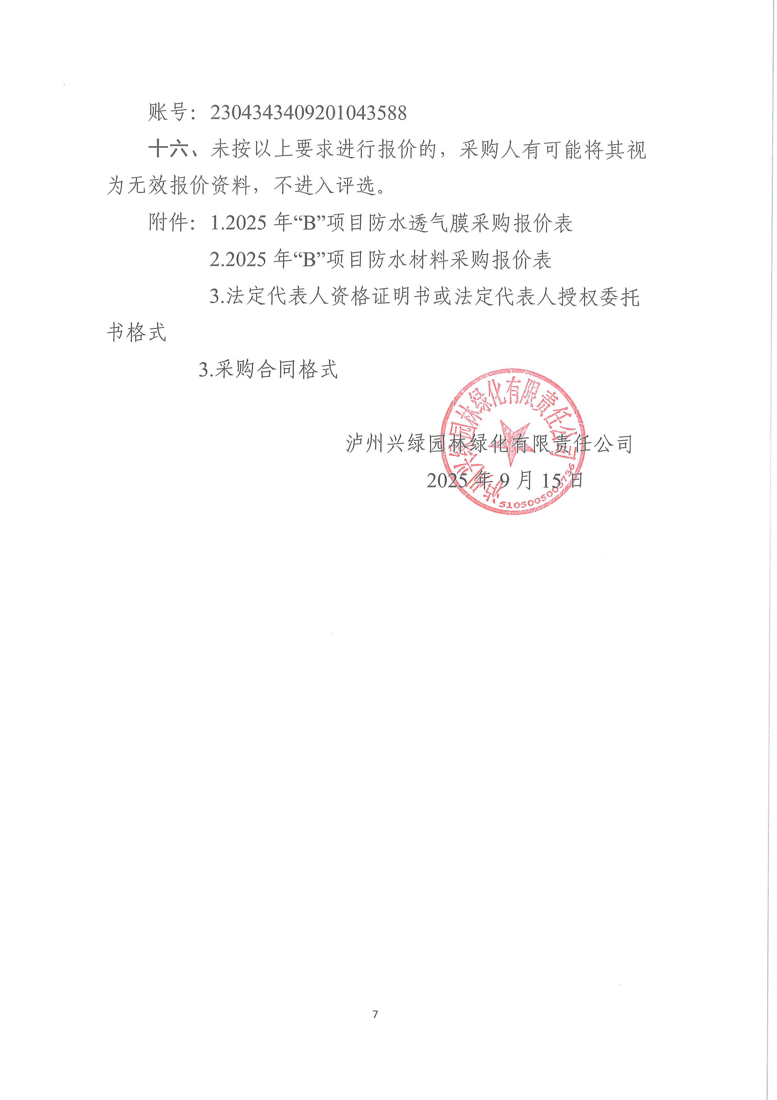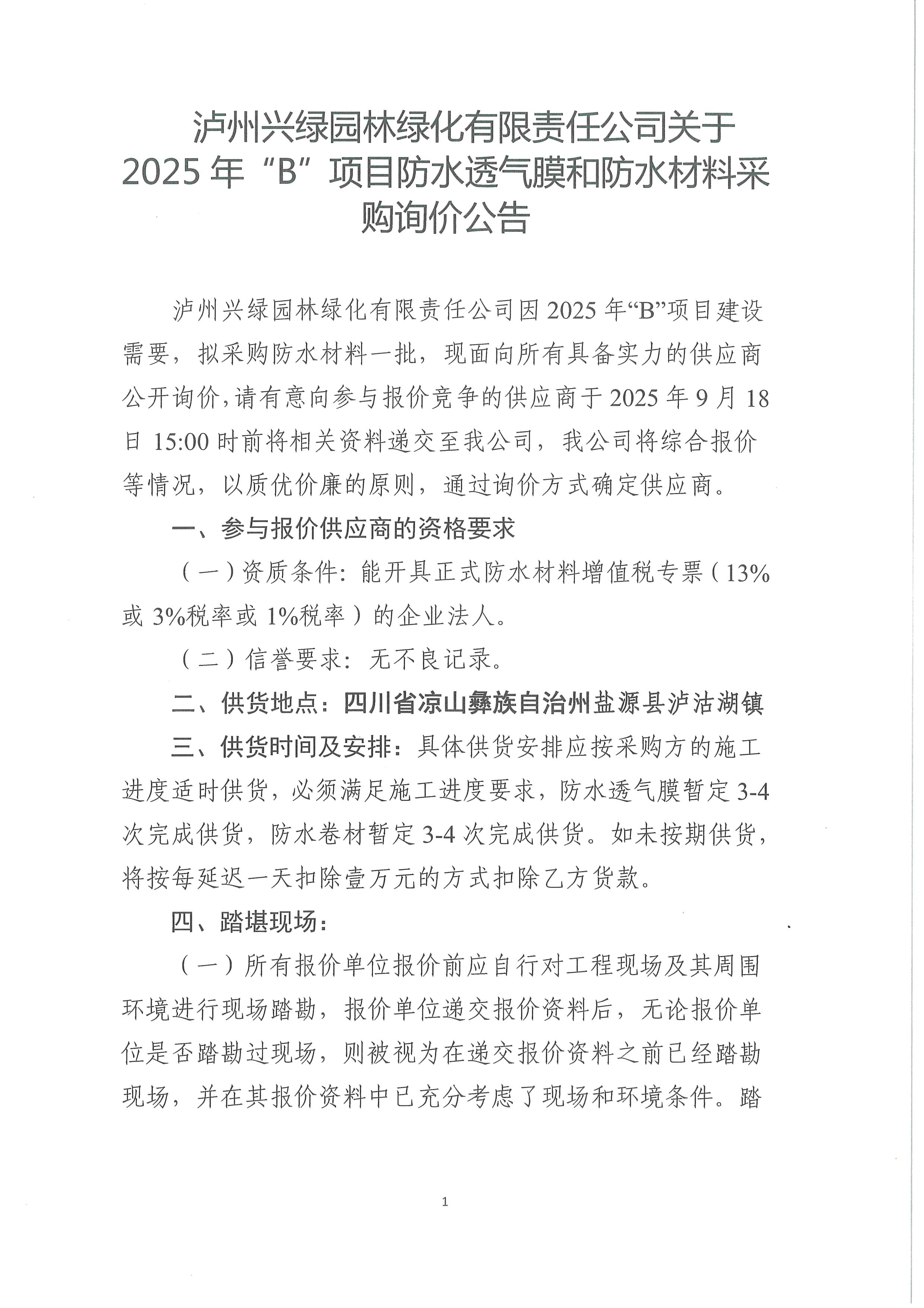 瀘州興綠園林綠化有限責任公司關于 2025年“B”項目防水透氣膜和防水材料采購詢價公告